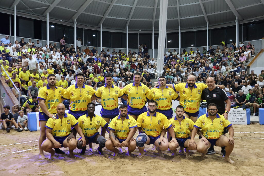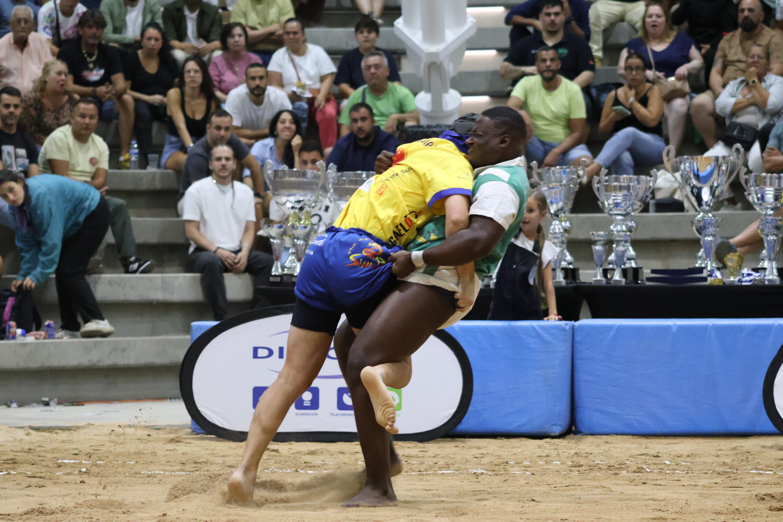 Se volvió a pisar la arena de Tasagaya, y en una final, con el alma y espíritu de lucha también remangado en los 12 pantalones azules que desfilaron. Tras una primera agarrada separada entre Cristo León (J) y Diego Fuentes (J), Lamine Dieng (J) ya estaba metido debajo del rival, comenzando con su repertorio en el que dejó fuera de brega a Ángel Sosa (J), para después toparse ya con el primero de los Destacados dándole las dos a Carlos Peraza (DC). Su mano por dentro marcó el ritmo de la agarrada, contreando en el primer acto y sacándolo por arriba apoyándose en esa mano como si quisiera Tocar por dentro. Remató su gran actuación ante Eusebio Díaz (DB): cayó en la primera con Cango, pero se rehizo empatando y dejando un magistral Toque p´trás en la tercera. En ese ímpetu también enroscó Garabato Raúl Díaz ante Jean Pierre, en la primera atacando, repitiendo en una preciosa contra. 3-6.